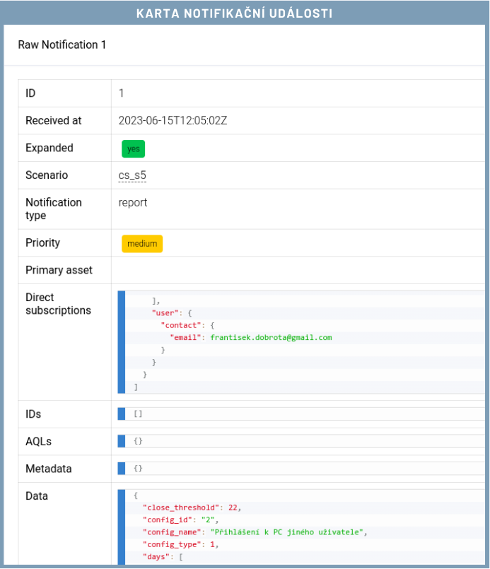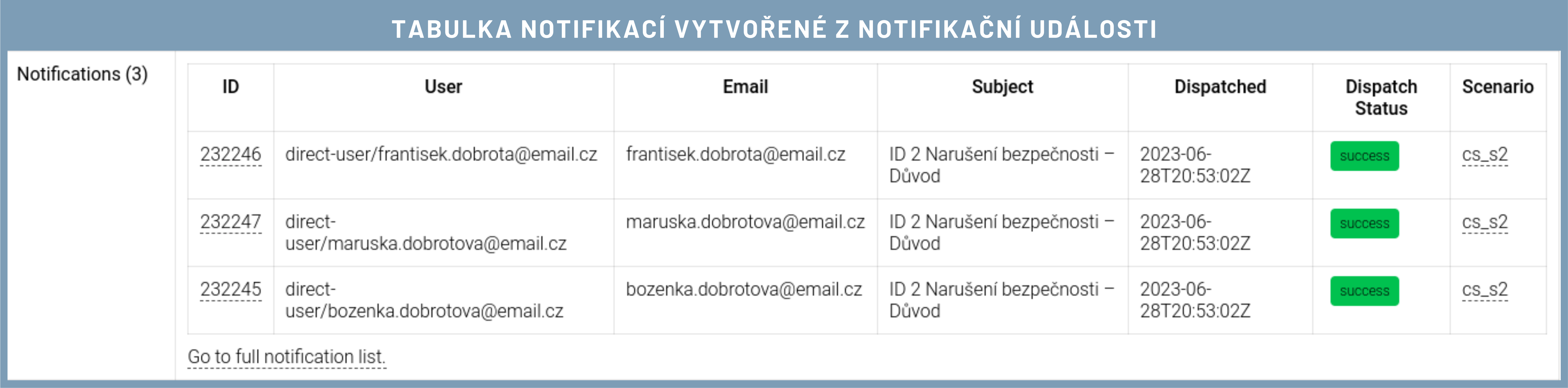 Notifications (count) - pokud už je událost zpracována, vidíte v kartě notifikace, které z ní byly vygenerovány. V závorce vidíte jejich celkový počet. Tabulka notifikací zaznamenává identifikační číslo notifikace, příjemce, jejich e-mail, předmět e-mailu, status odeslání a scénář, ke kterému notifikace náleží.
