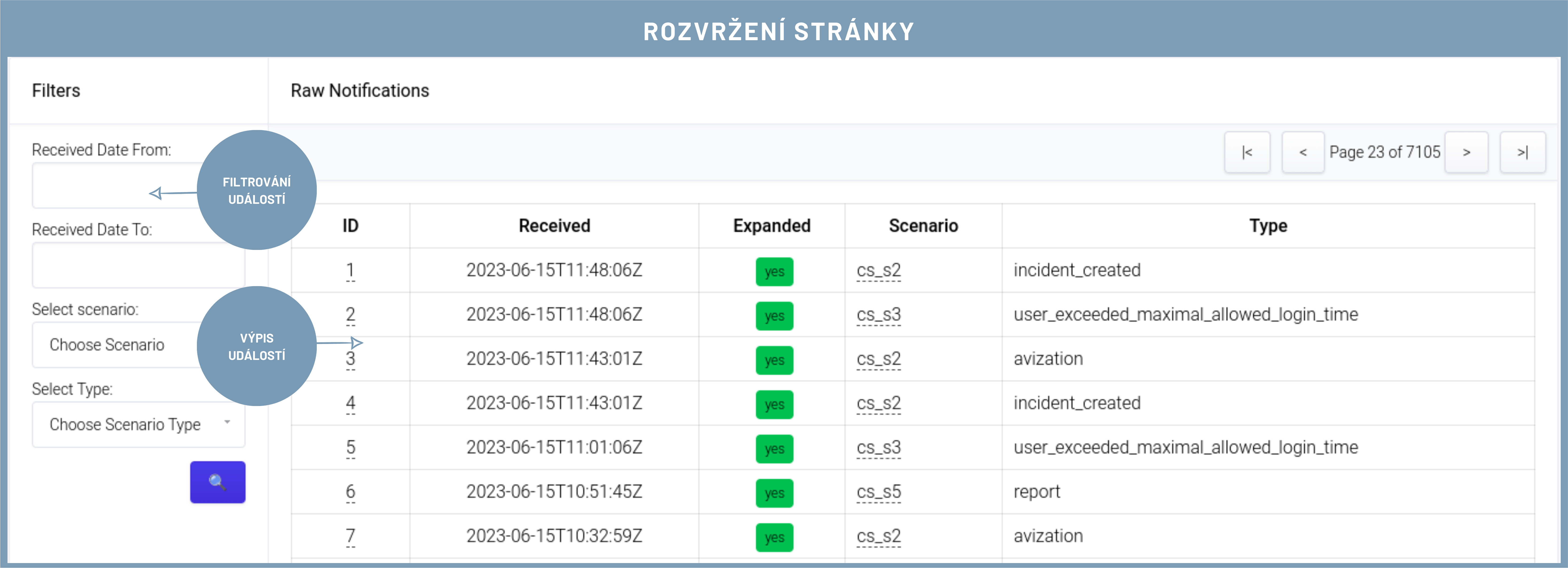 V levé části vidíme možnost filtrování událostí, v pravé pak výpis výsledků filtrování.