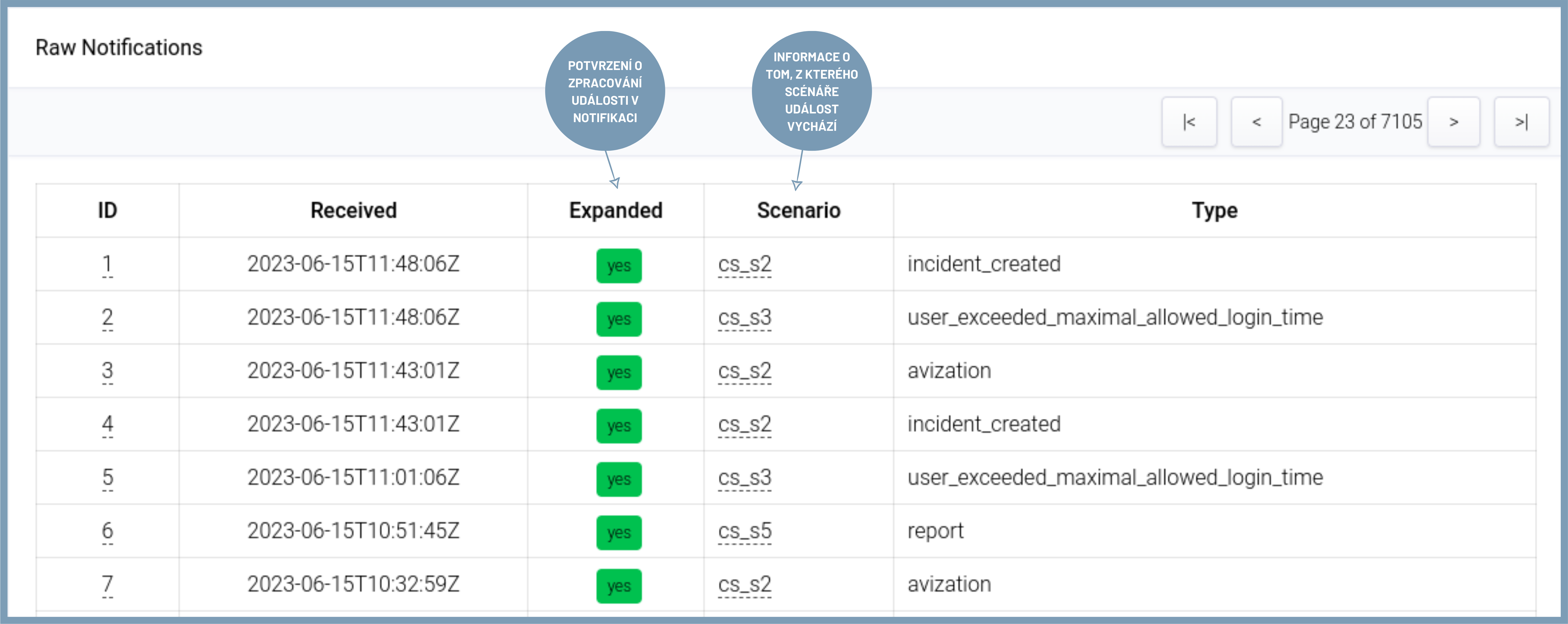V prvním sloupci vidíte číslo notifikační události - ID s proklikem na její detail.