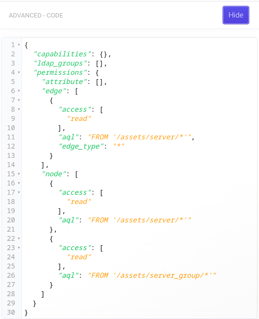 Sekce editoru ADVANCED - CODE umožňuje přesnější nastavení rolí na nižší úrovni. Zde můžete díky editaci ve formátu JSON definovat oprávnění mnohem operativněji a rozsáhleji než dovoluje editor. Můžete zasáhnout do možností, které UI nenabízí. Je však nutné ovládat práci s formátem JSON a zadat definici správně.