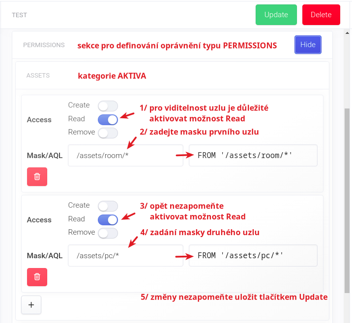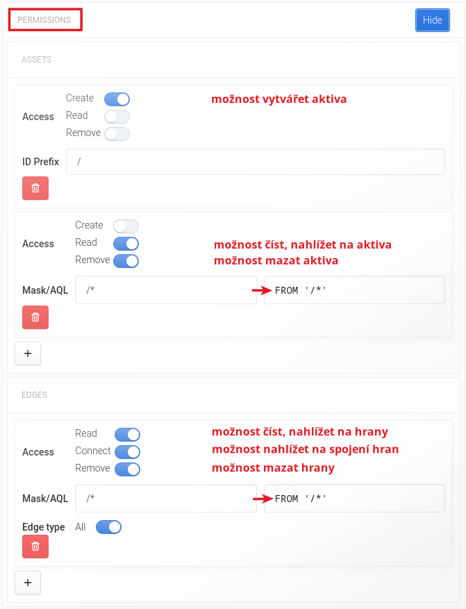 V případě přidělování oprávnění k aktivům (ASSETS) můžete vybírat z těchto možností: Create, Read a Remove. Aktivujete je vždy posunutím posuvníku vpravo.