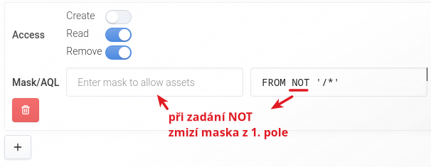 U Read a Remove zadáváte ID aktiva. Zde můžete uvést celou ID masku aktiva, nikoliv jen prefix. Definujete tím přímo, která konkrétní aktiva může uživatel vidět nebo mazat, zadat můžete ale i prefix. ID maska se automaticky přepíše v AQL dotaz s klauzulí FROM.