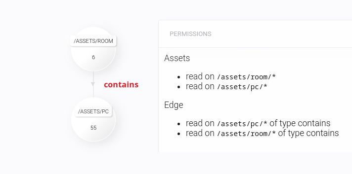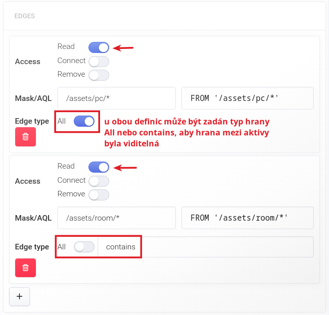Definujte hranu z prvního uzlu (aktiva). V definici zadejte minimálně možnost Read, aby uživatel hranu viděl. Dále zadejte masku aktiva (/assets/rooms/*). U hran je potřeba zadat také typ hrany. V této ilustraci to bude typ contains. Můžete posunout posuvník i na All, neboť taot volba zahrnuje všechny typy, tudíž i typ contains.