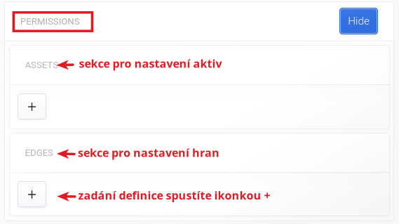 Kategorie PERMISSIONS pro nastavení aktiv a hran