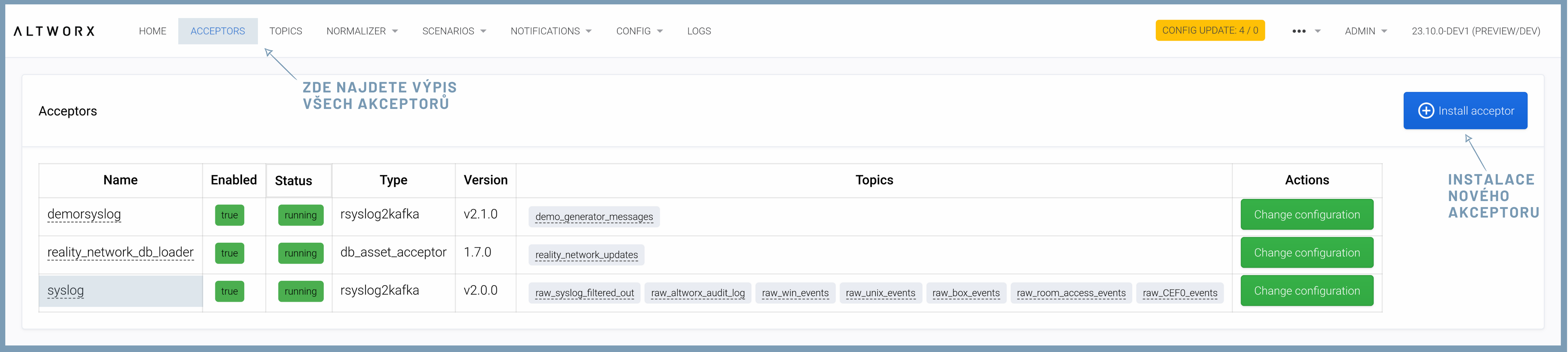 Seznam všech akceptorů, které získávají pro Altworx data, můžete najít pod záložkou ACCEPTORS v horní liště aplikace. Zde jsou akceptory přehledně vypsány do tabulky. Na první pohled tak můžete vidět, které akceptory právě běží a které jsou pozastaveny.