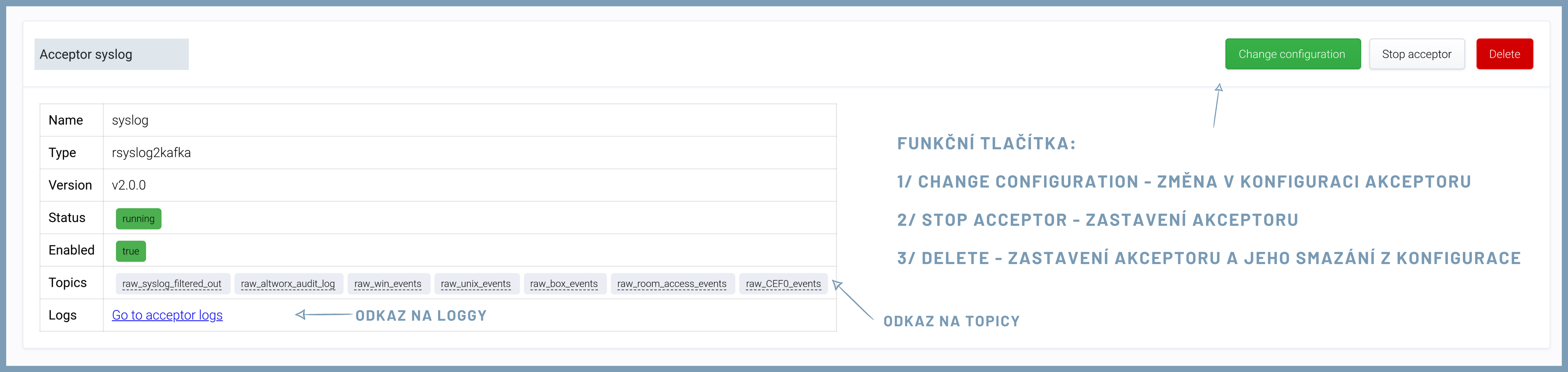 Change configuration- umožňuje změnit konfiguraci akceptoru, stejně jako tlačítko v Přehledové tabulce akceptorů,Stop acceptor- zastaví akceptor,Delete- zastaví akceptor a smaže ho z konfigurace, současně smaže i veškerá nastavení a data související s akceptorem, konfigurace zůstává v historii deploymentu, data však budou nenávratně smazána.