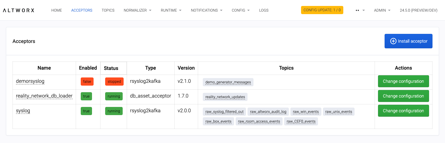 - Disabled, running - akceptor je vypnutý, ale běží. Jedná se spíše o okrajový případ. Běžně by nastávat neměl. Vyvolat jej může chyba v aplikaci Altworx nebo případ, kdy byl akceptor spuštěn ručně.