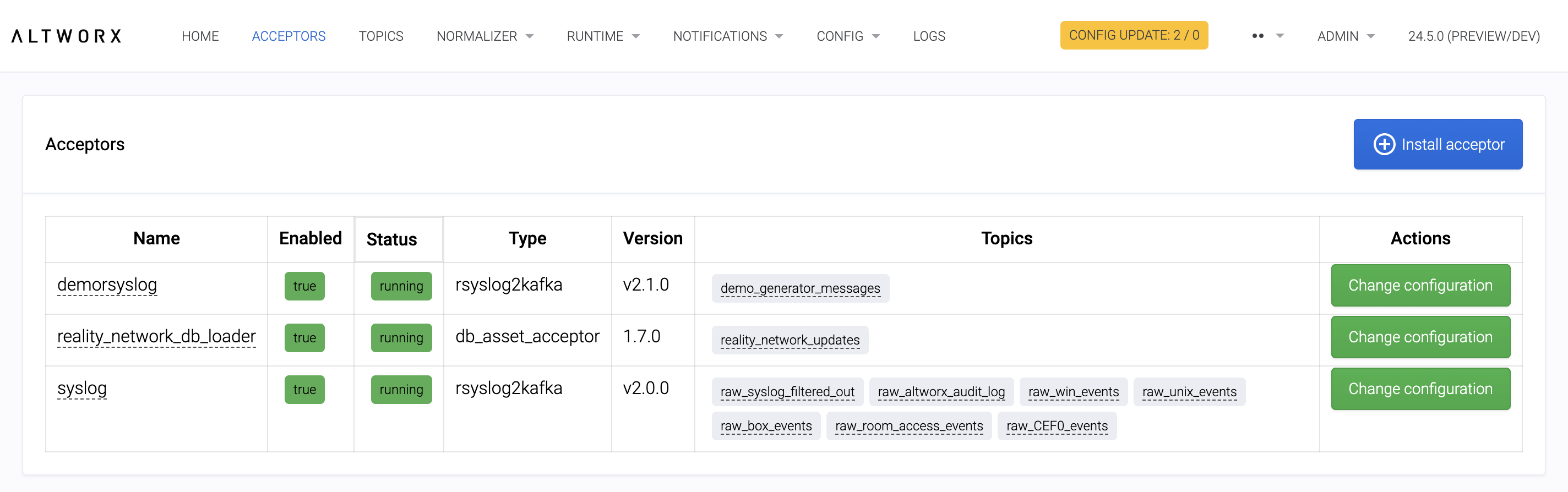 V přehledu akceptorů najdete funkční tlačítka Install acceptor a Change acceptor.