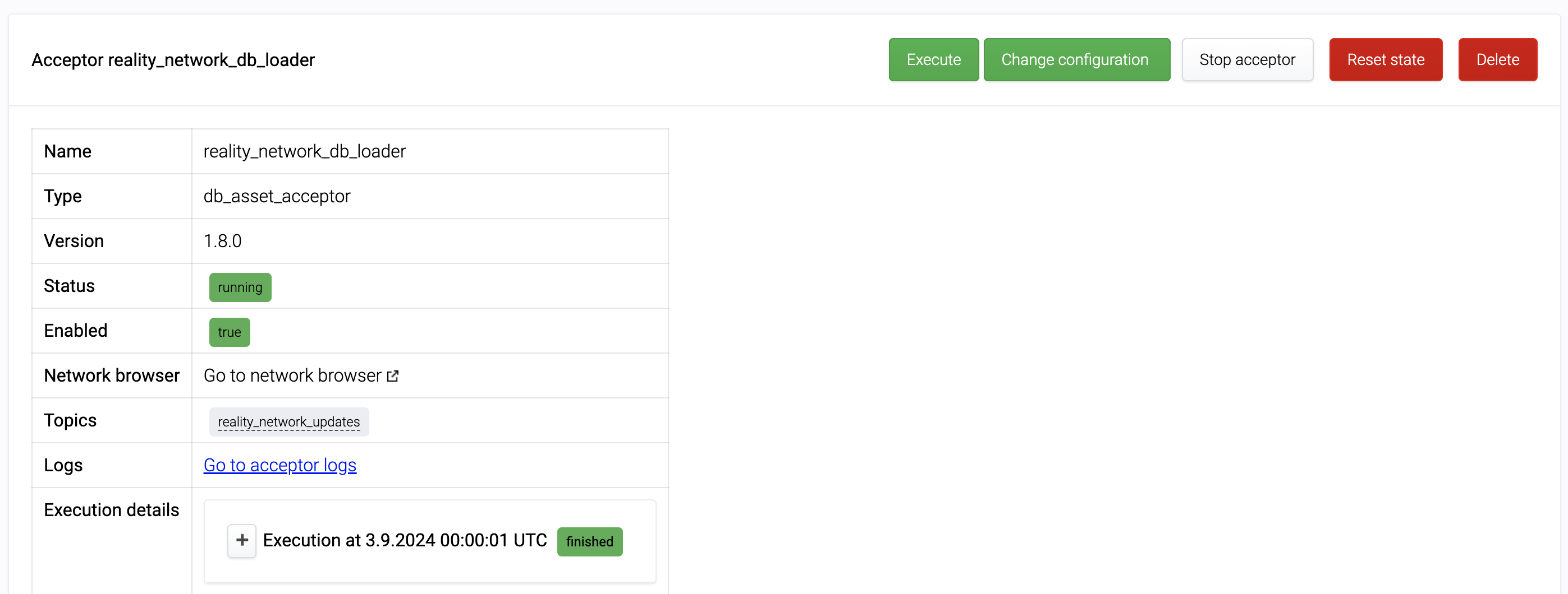 Opět se jedná o funkci, která je zatím určena pouze pro db_asset_acceptor. Tlačítkem Reset state vpravo nahoře resetujete stav akceptoru, čímž smažete historii akceptoru. Smazány budou raw topicy, runtime topicy i run, který s runtime topicy pracoval. Znovu se vytvoří raw topic, normalizační pipelina a runtime topicy s runy.