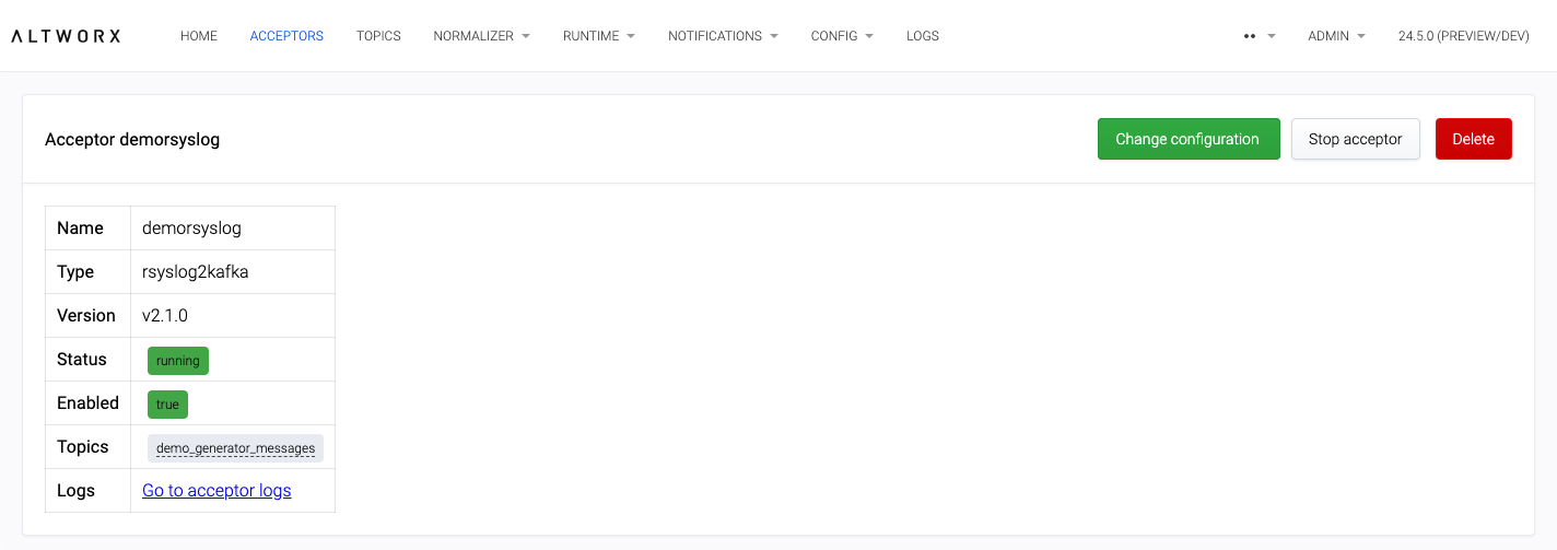 Akceptor bude zastaven, pokud běží. Bude odstraněn z celkové konfigurace, včetně jeho vlastní konfigurace. Rovněž budou nenávratně smazána data akceptoru. Ztratí se i z přehledu akceptorů na úvodní stránce záložky ACCEPTORS.