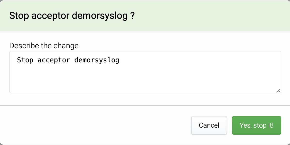 Opět se vám otevře potvrzující dialog, kde můžete popsat změnu a kde potvrdíte znovuspuštění akceptoru potvrdit tlačítkem Yes, start it!.