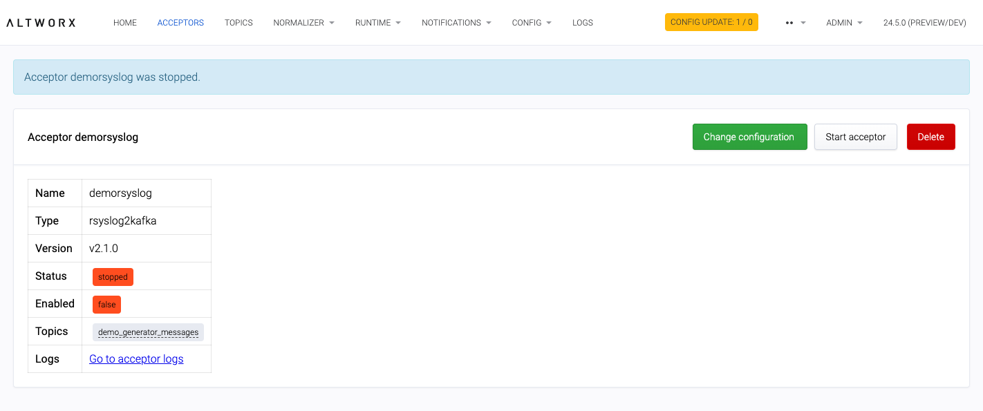 Zastavený akceptor se pak projeví v přehledu akceptorů s červenými poli Enabled: false a Status: stopped.