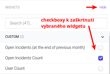 Úvodní záložka DASHBOARD nabízí nástěnku widgetů, které stručně shrnují důležité informace a činí je pro uživatele na první pohled zřejmé. Díky widgetům, který si na svou nástěnku nastavíte, můžete na jedné stránce vidět, kolik je právě otevřeno incidentů, jak stoupá jejich závažnost, do jaké míry jsou zasažena která aktiva apod. Každý uživatel si sám určuje, které z widgetů bude na své nástěnce mít.