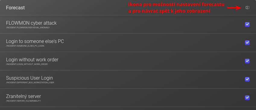 Kliknete-li ve widgetu Forecast na některé z polí se sytou barvou a číslem, otevře se ve widgetu Details seznam incidentů zvolené závažnosti.