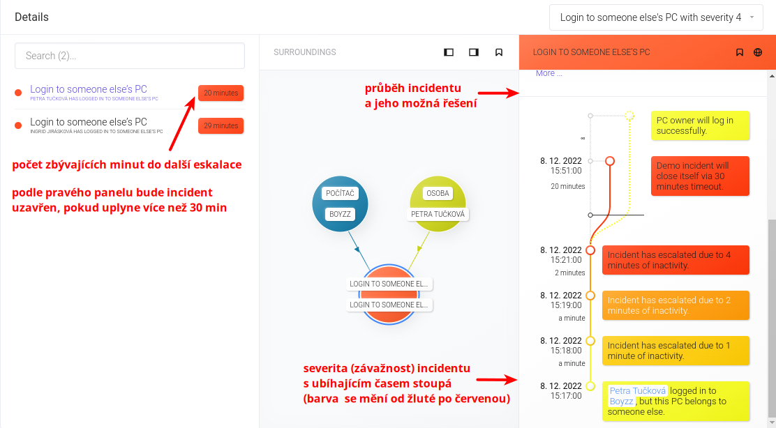 Následující příklad ukazuje náhled na widget Details, který by se vám ukázal, pokud byste klikli na červené pole s číslem 2 (tzn. dva incidenty s nejvyšší závažností). V levém panelu vidíte výpis obou incidentů. Označen je první incident. Jeho okolí je pak zobrazeno vprostřed widgetu. Detailní informace s průběhem incidentu můžete najít vpravo.