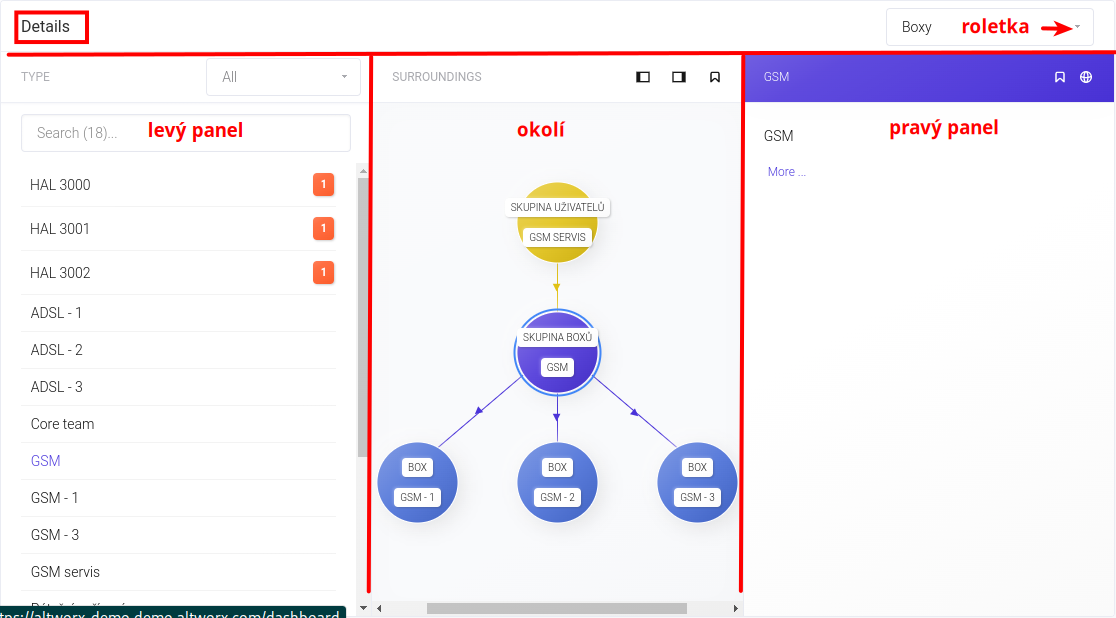 Widget Details je rozvržen do tří panelů: levý panel, okolí a pravý panel. Nad panely je hlavní lišta, kde si můžete vpravo pod roletkou zvolit skupinu aktiv k zobrazení.