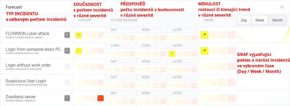 - FUTURE CHANGES - předpověď počtu incidentů v různé severitách ve 3 různých intervalech v budoucnosti (dle konfigurace).