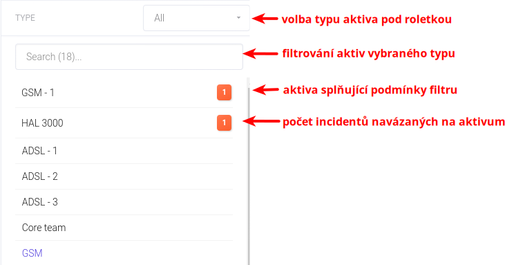 - vidět seznam aktiv vybraného typu a počet incidentů navázaných na konkrétní aktiva.