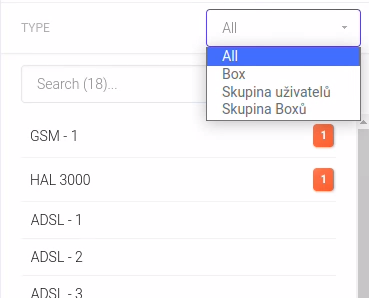Typ aktiva můžete vybrat pod roletkou. Po vybrání se zobrazí jen aktiva daného typu. Pokud seznam obsahuje pouze aktiva jednoho typu, roletka se nezobrazí.