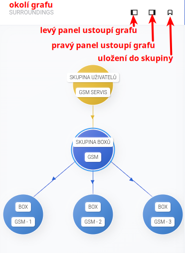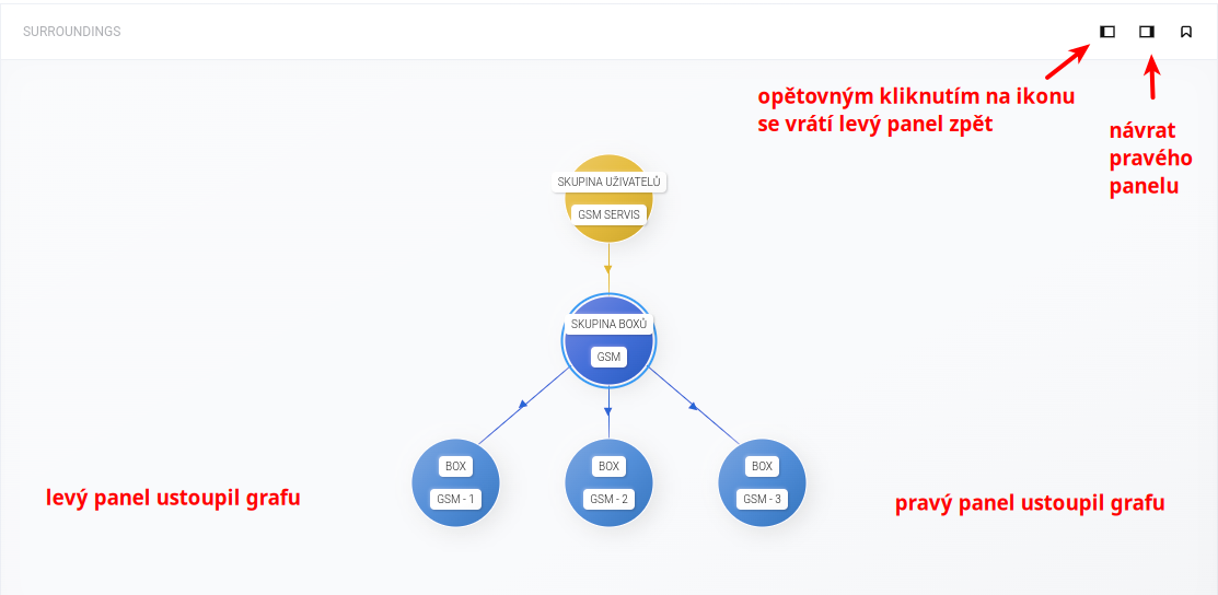 V prostředním panelu SURROUNDINGS můžete vidět bezprostřední okolí zvoleného aktiva. V horní části tohoto panelu se nachází tři funkční ikony: