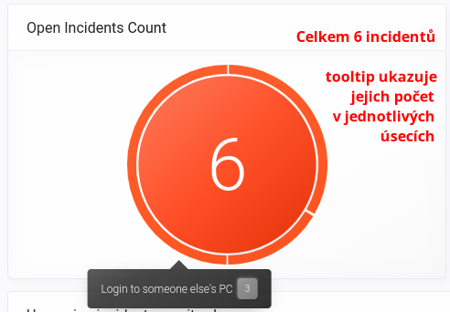 V incidentu Open incidents Count vidíte, že je právě 6 otevřených incidentů. Pomocí tooltipů se můžete podívat na jejich rozložení do typů (Login to someone else's PC - 3,FLOWMON cyber attack - 2, Zranitelný server- 1).