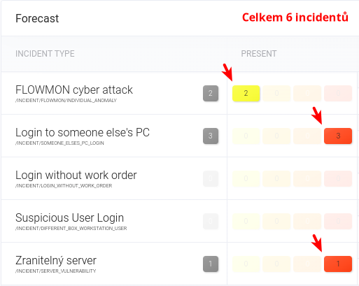 Pokud si na svůj Dashboard nastavíte i widget Forecast, uvidíte v něm na první pohled rozložení těchto 6 incidentů do konkrétních 3 typů incidentů (FLOWMON cyber attack / váže se se 2 aktivy typu Boxy, Login to someone else's PC / váže se s 3 aktivy typu Počítač a Osoba, Zranitelný server/ váže se s aktivy typu Vulnerability a Server).