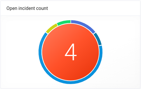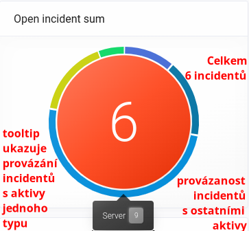 Tento widget vám ukazuje aktuální počet otevřených incidentů. Můžete si všimnout, že jeho okolí je členěno na úseky odlišných barev podobně jako ve widgetu Open incident sum. Barva úseku odpovídá barvě typu aktiv, s kterými jsou incidenty provázány. Velikost úseku odpovídá poměru aktiv konkrétního typu vůči celkovému počtu souvisejících aktiv. Při najetí na vybraný úsek se vám ukáže tooltip s názvem typu a počtem souvisejících aktiv k incidentům.