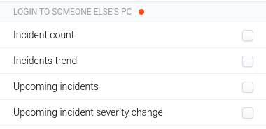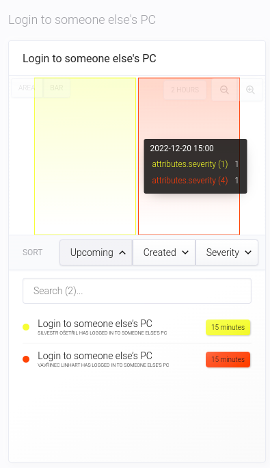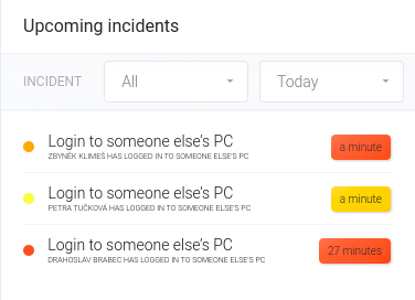 Widget Login to someone else's PC incident je variací na globální widget Incidents. Rovněž se skládá ze dvou částí: grafové a seznamu. U grafu je možné zvolit způsob zobrazení AREA nebo CHART. Incidenty lze řadit podle nadcházející eskalace (Upcoming), času vytvoření (Created) nebo závažnosti incidentu (Severity).