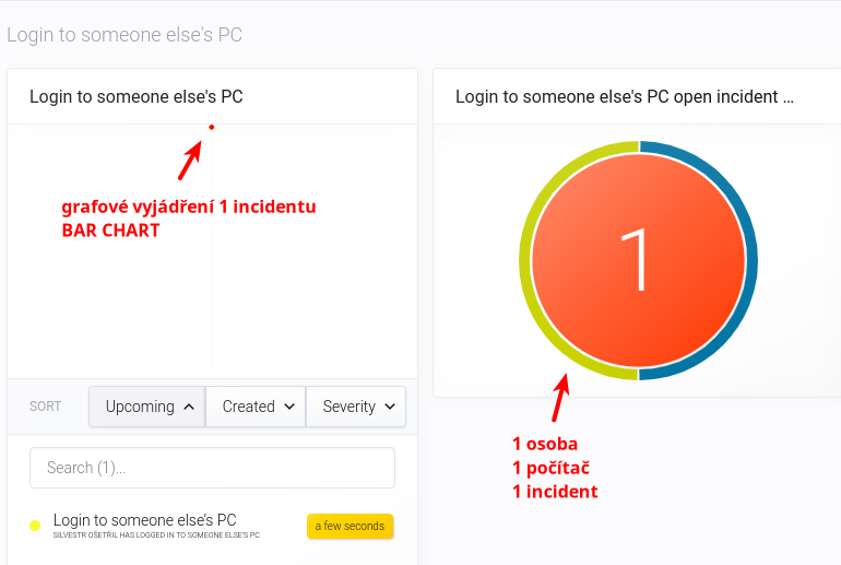 Na příkladu níže vidíte souvislost mezi oběma widgety jednoho typu incidentu (Login to someone else's PC). Graf prvního widgetu zobrazuje jeden jediný incident v grafu typu BAR (jeden bod). Vidíte zde jeho čas nadcházející eskalace. Stejný incident avšak jiným způsobem zobrazuje widget druhý. Zde pro změnu vidíte souvislost s jinými aktivy.