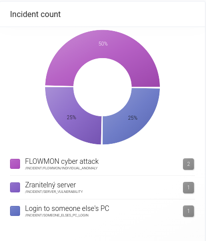 Widget zobrazuje rozložení právě otevřených incidentů do jejich typů. Barevné výseče kružnice s procentuálním označením na první pohled znázorňují, v které oblasti vzniká nejvíce nesrovnalostí s nastavenými scénáři. Pod kružnicí je uveden seznam typů incidentů s konkrétními počty incidentů v nich v šedém poli.