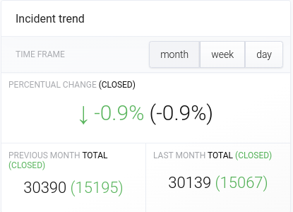 Zaznámenává procentuální změnu počtu incidentů ve zvoleném období (month, week, day). Šipka před procenty ukazuje stoupající či klesající trend oproti minulému předcházejícímu období. V závorce je uvedena procentuální změna uzavřených incidentů. Níže můžete vidět rozdělení na změnu oproti předcházejícímu zvolenému období (previous) a minulému období (last), kdy předcházející měsíc je 30 dní před datem zobrazení widgetu a minulý měsíc je 30 dnů před těmito 30 dny.