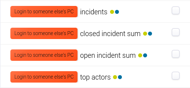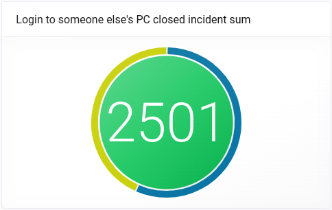 Widget Login to someone else's PC closed incident sum znázorňující celkovou sumu uzavřených incidentů typu Login to someone else's PC. Prostředí kruhu je zelené - již žádný akutní stav- Okolí vytvářejí barvy typu aktiv, se kterými incidenty souvisely. Zde je vidět, že to byly Osoby (žlutá barva) a Počítače (modrá barva). Z poměru barev je vidět že se přihlašovalo méně osob na více počítačů.