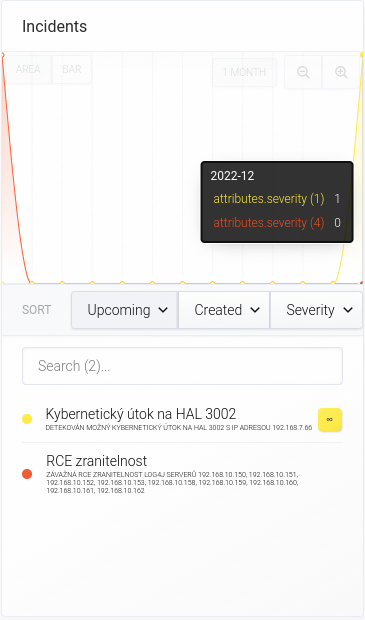 Widget Incidents ukazuje v grafu a seznamu aktuálně otevřené incidenty. Graf lze zobrazit jako AREA (spojnicový graf) nebo CHART (sloupcový graf). V grafu lze volit granularitu prostřednictvím znamének - a +. Tooltip grafu se zobrazí po najetí myší na graf. Vidíte na něm období a počet incidentů rozdělených podle závažnosti.