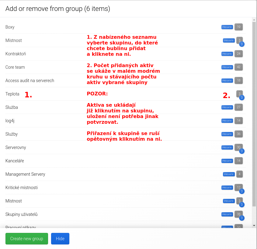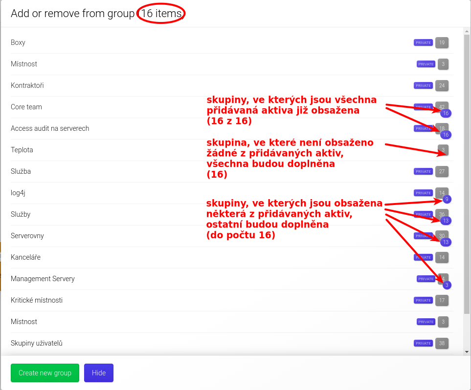 otevře se pop-up okno se seznamem vytvořených skupin, u počtu stávajících aktiv vpravo se ukáže malý modrý kruh s číslem, které vyjadřuje, kolik z vybraných aktiv je už ke skupinám přiřazeno,
