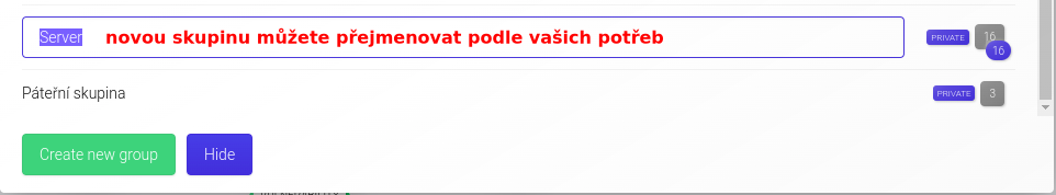 Klikněte na tlačítko Create new group ve spodní části pop-up okna, vyplňte její název v povinném, červeně označeném poli a potvrďte jej tlačítkem klávesnice Enter.
