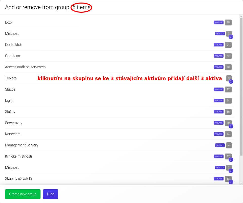 Otevře se vám pop-up okno, kde vidíte, do kterých skupin jsou serverovny již zařazeny. Zvolíte skupinu Teplota. Kliknutím na ni se přidají serverovny i do této skupiny.