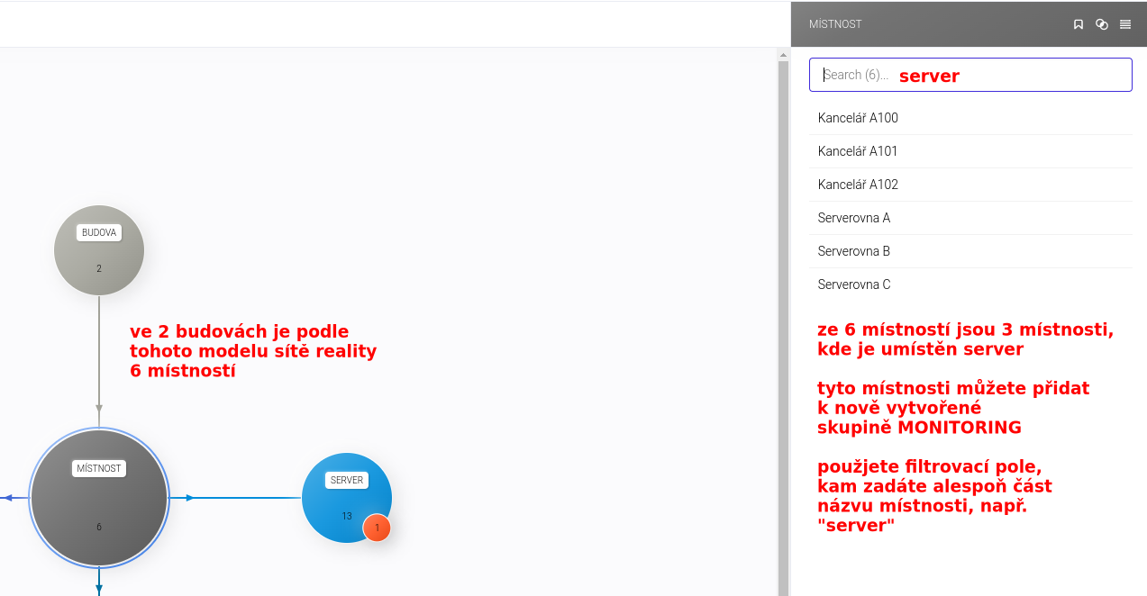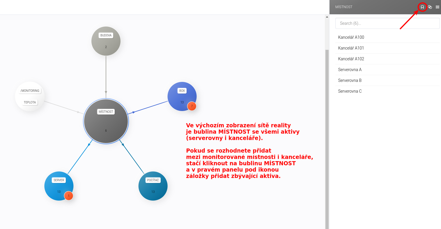 Chcete-li propojit nové aktivum MONITORING s bublinou MÍSTNOST, abyste zařadili serverovny mezi monitorované místnosti, pak klikněte na aktivum MÍSTNOST.