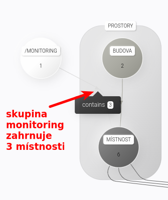 Kliknutím na záložku NETWORK se vrátíte do výchozího zobrazení sítě reality. Zde uvidíte bublinu MÍSTNOST se všemi 6 aktivy. Je zde na první pohled zřetelná i vazba k bublině MONITORING. V této vazbě jsou však prozatím zahrnuta 3 aktiva z 6 (servery). O počtu vazeb vás informuje tooltip hrany.