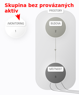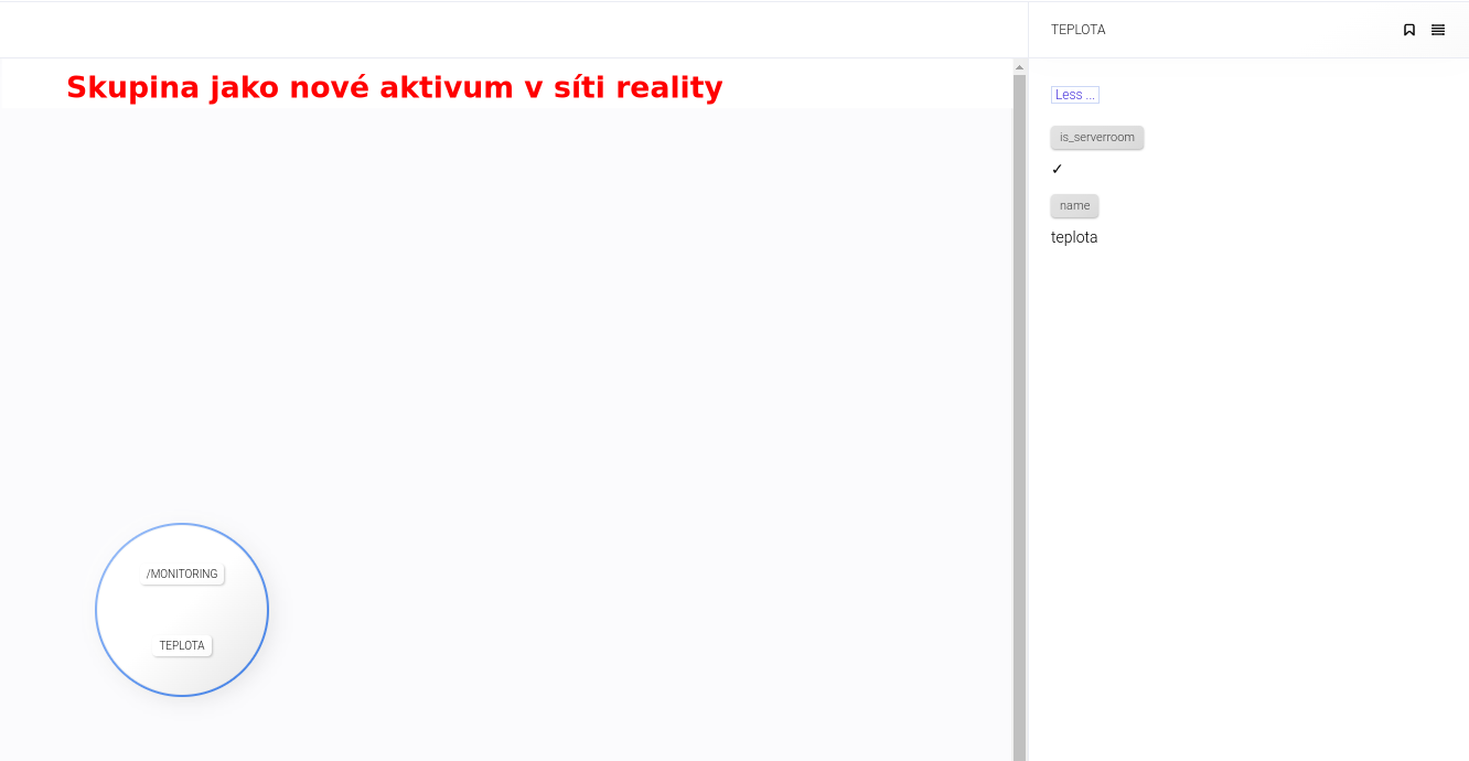 Pro ilustraci uvádíme případ, ve kterém chceme vytvořit skupinu všech místností, kde je umístěna serverovna a kde je například nutné hlídat optimální teplotu v místnosti. V síti reality vytvořené pro tuto ilustraci vidíme aktiva typu BUDOVA a typu MÍSTNOST. Místnosti, které v této síti reality existují, jsou dvojího druhu: serverovny (v budově Datacentrum) a kanceláře (v budově Centrála). S typem BUDOVA nesouvisí nová skupina přímo, pouze přes místnosti. Pro kontrolu určitých místností (serveroven) vytvoříme novou skupinu s názvem TEPLOTA (název v dolní části bubliny) a typem MONITORING (název v horní části bubliny). Skupinu můžete v síti reality vidět také jako bublinu, kdy nahoře je uvedeno MONITORING a dole 1 (počet aktiv ve skupině).