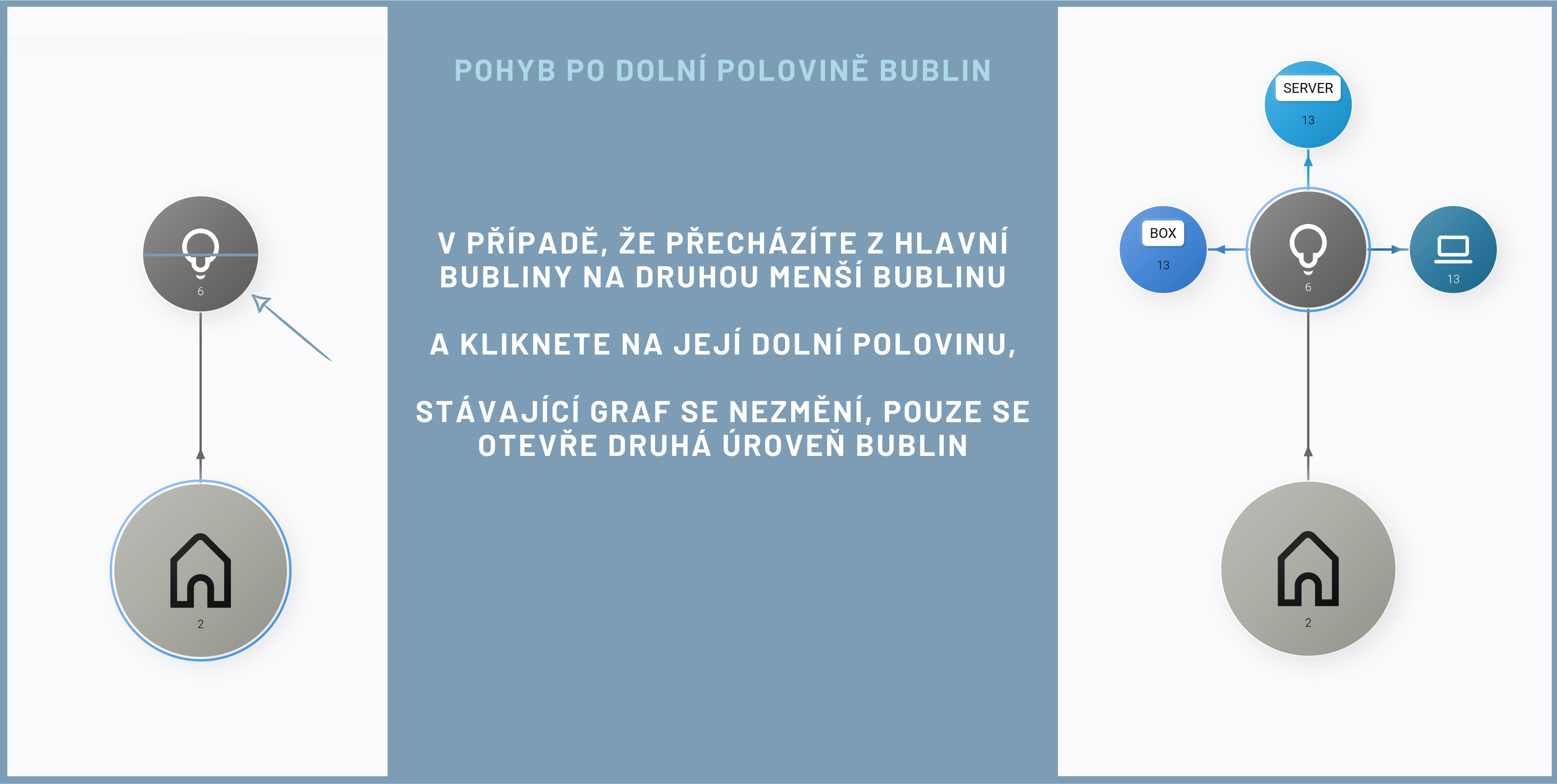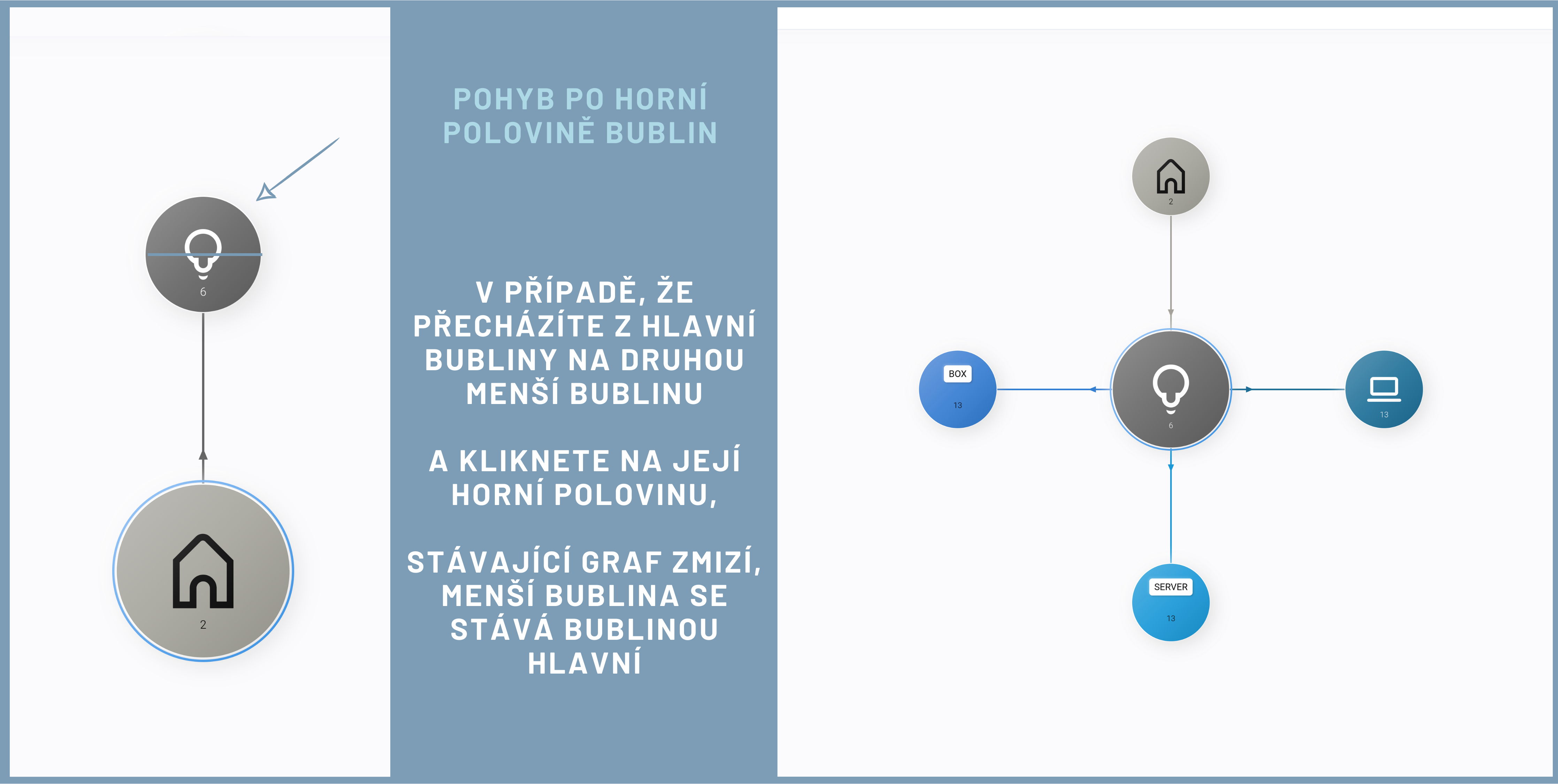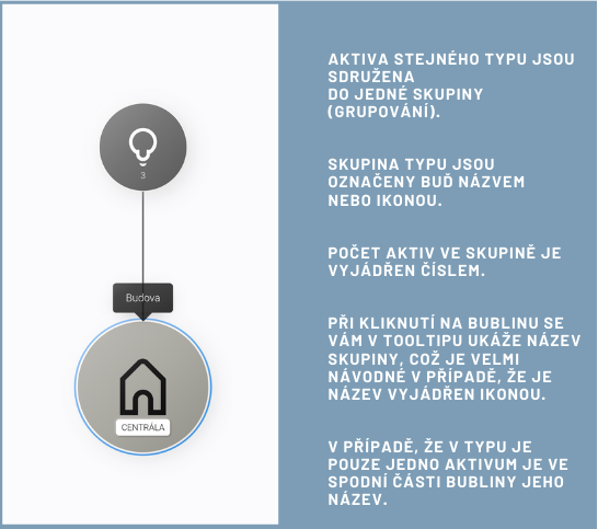 Při kliknutí na horní polovinu aktiva zmizí graf, který byl právě na vaší obrazovce. Přicházíte tak o prostředí, které jste měli nastaveno a získáváte prostředí nové. Označené aktivum se stává nově výchozím aktivem. Okolí aktiva vytváří bubliny, která s tímto aktivem přímo souvisí. Pohyb po horní polovině aktiv vám lépe osvětlí vztahy pouze k vybranému aktivu, aniž by vás mátly další vztahy v síti reality.