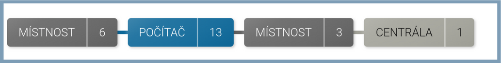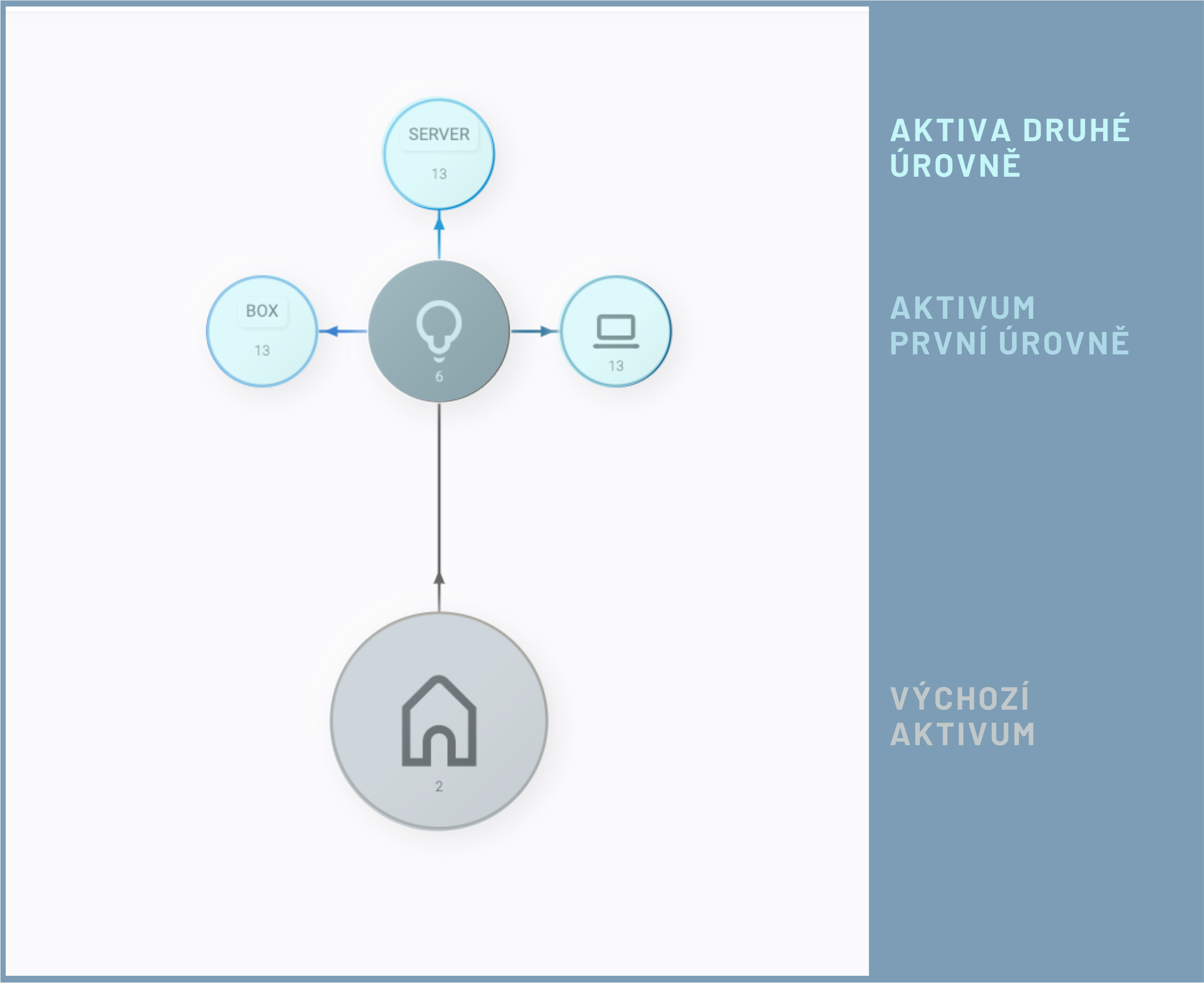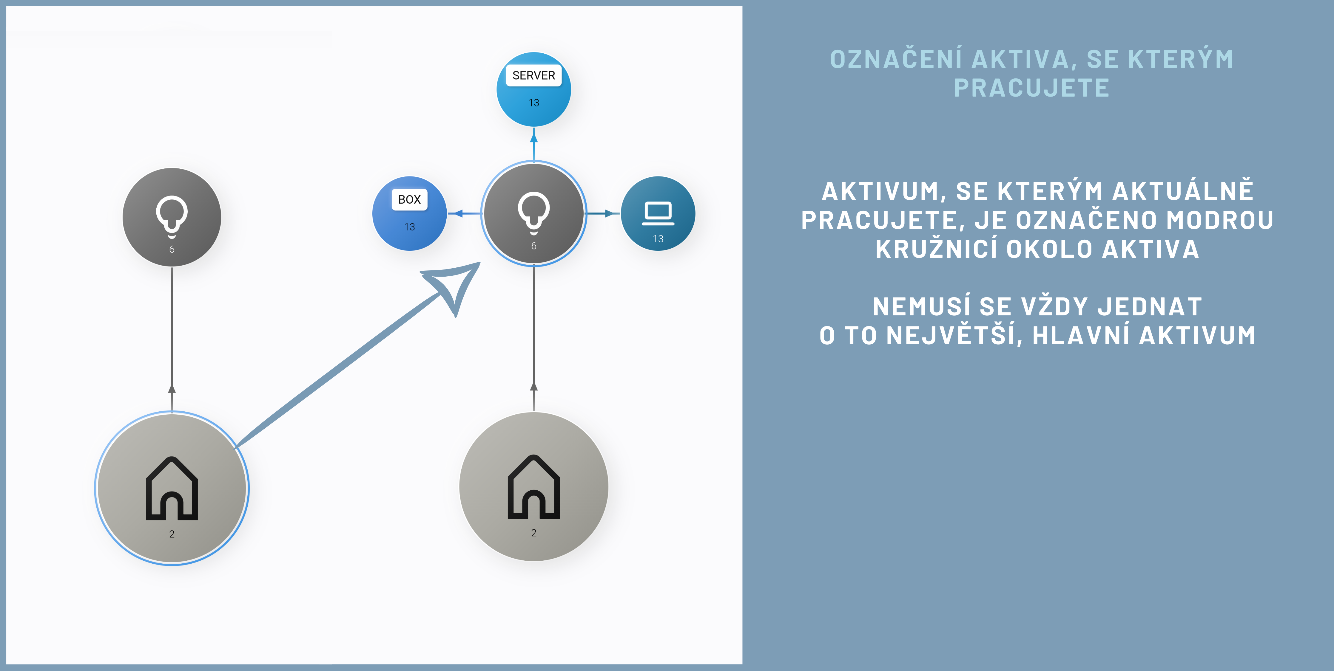 Aktivum, se kterým právě pracujete, je označeno modrým kruhem po obvodu. Nemusí to být vždy výchozí / největší aktivum. Aktuálně používané může být aktivum i v 1. a 2. úrovni od výchozího aktiva. K takovémuto aktivu je pak v pravém panelu vypsána legenda s bližšími informacemi.