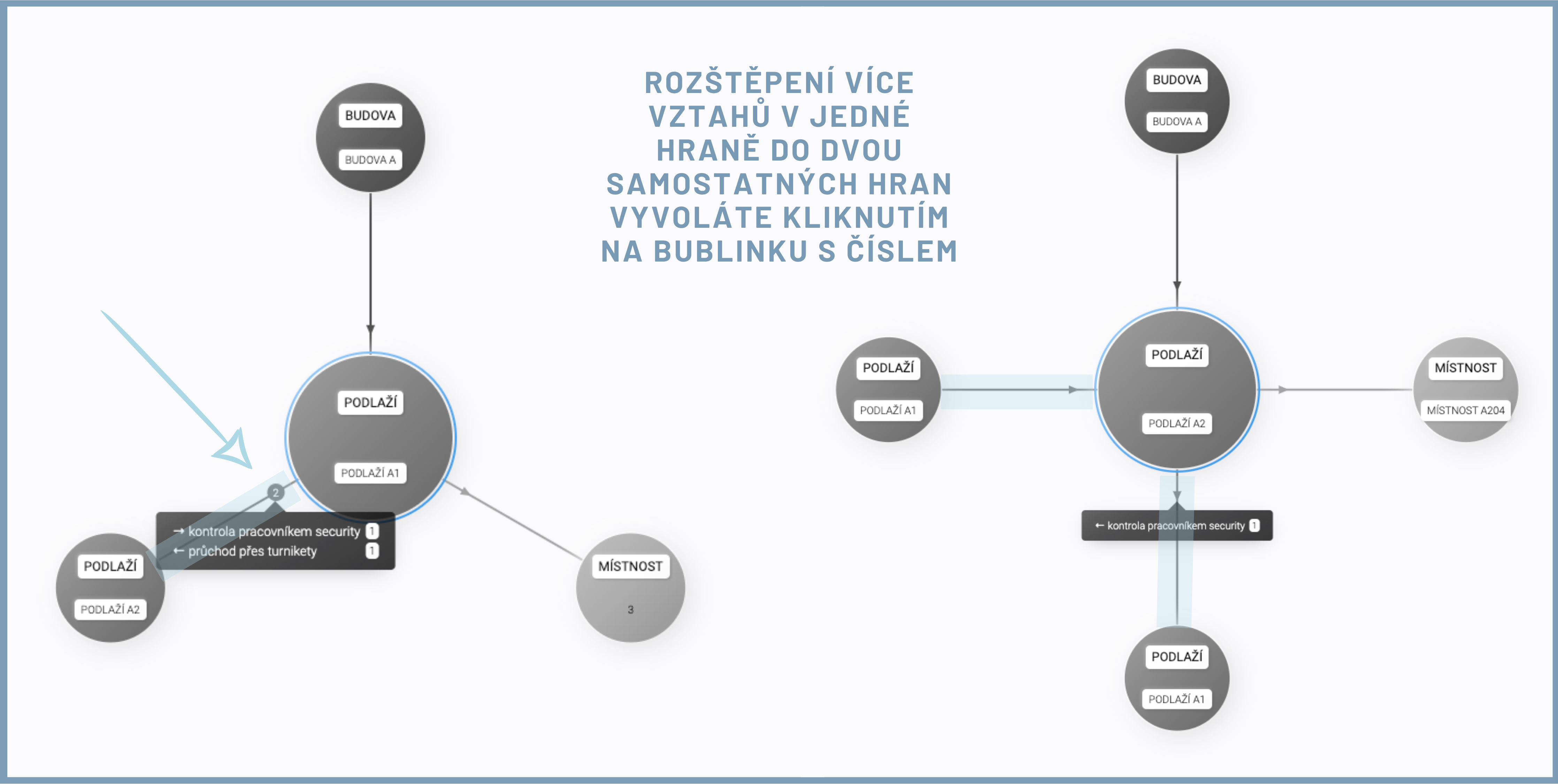 Tyto různé vztahy zobrazené v jedné šipce můžeme separovat na více šipek, které pak zastupují jednotlivé vztahy zvlášť. Tato funkce funguje velmi intuitivně kliknutím na bublinku s počtem hran.