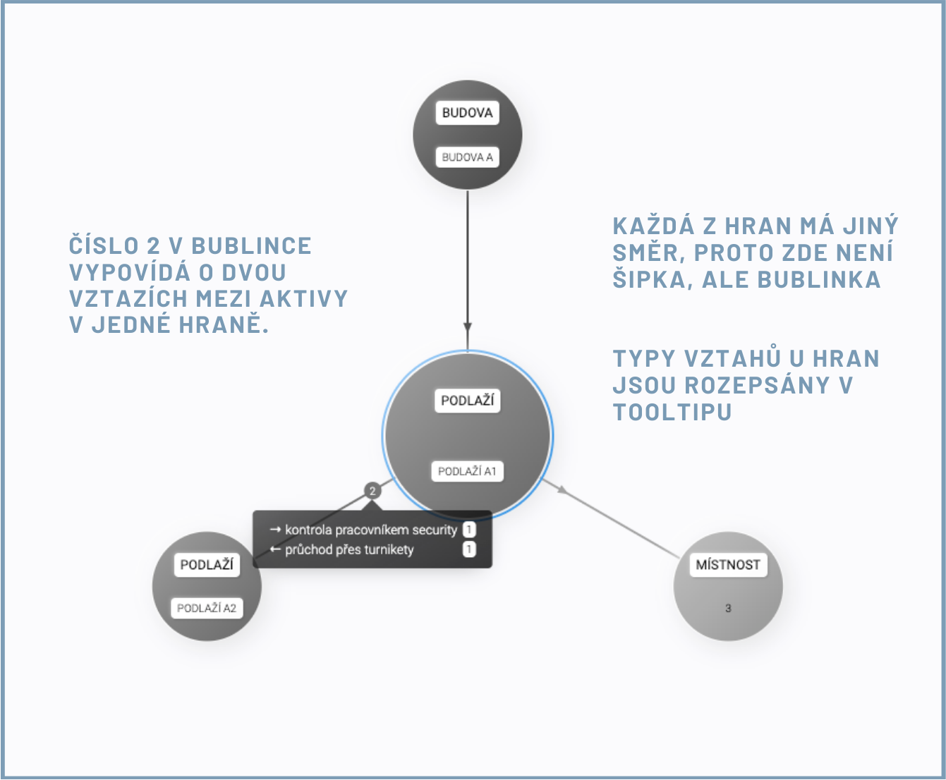 Při procházení sítí reality se můžete řídit i vztahy, které mezi sebou aktiva mají. Ty jsou vyhádřeny hranou, jak bylo vysvětleno v kapitole Základní pojmy. Typ vztahů uvidíte v tooltipu při najetí myší na hranu. Směr vztahu mezi aktivy je vyjádřen šipkou. Pokud je vztahů mezi aktivy více a mají různý směr, pak je na hraně místo šipky bublinka s počtem hran.