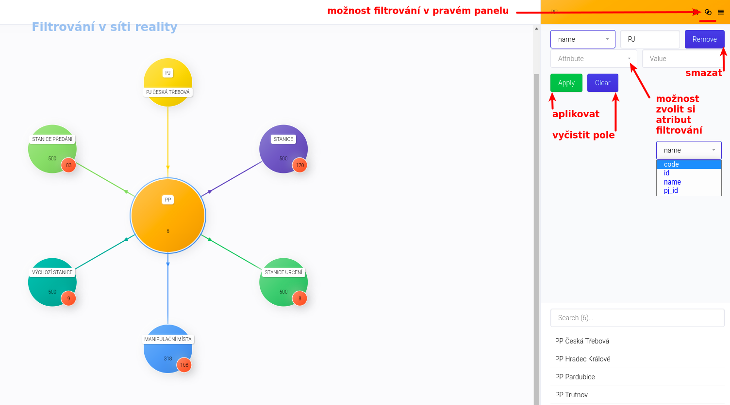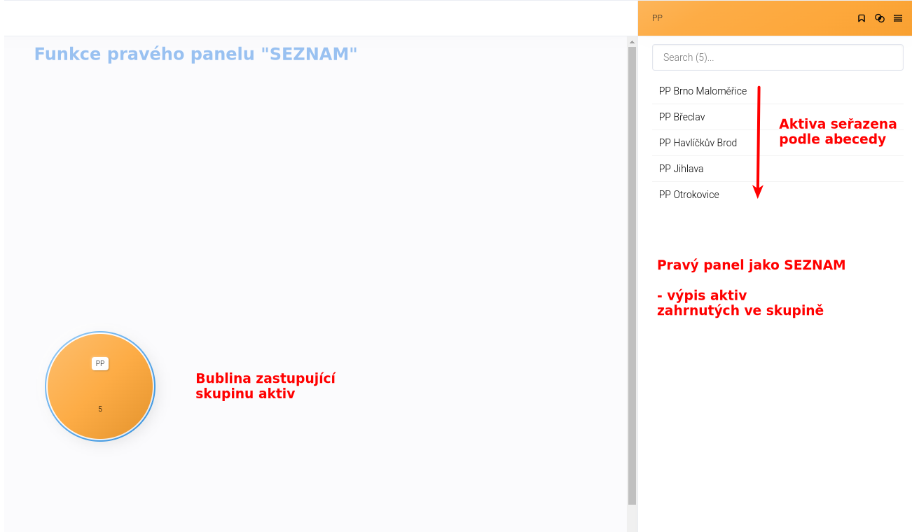 Pravý panel může sloužit jako navigace pro grafické zobrazení sítě v levém panelu. Kliknete-li na některé z aktiv v seznamu,
