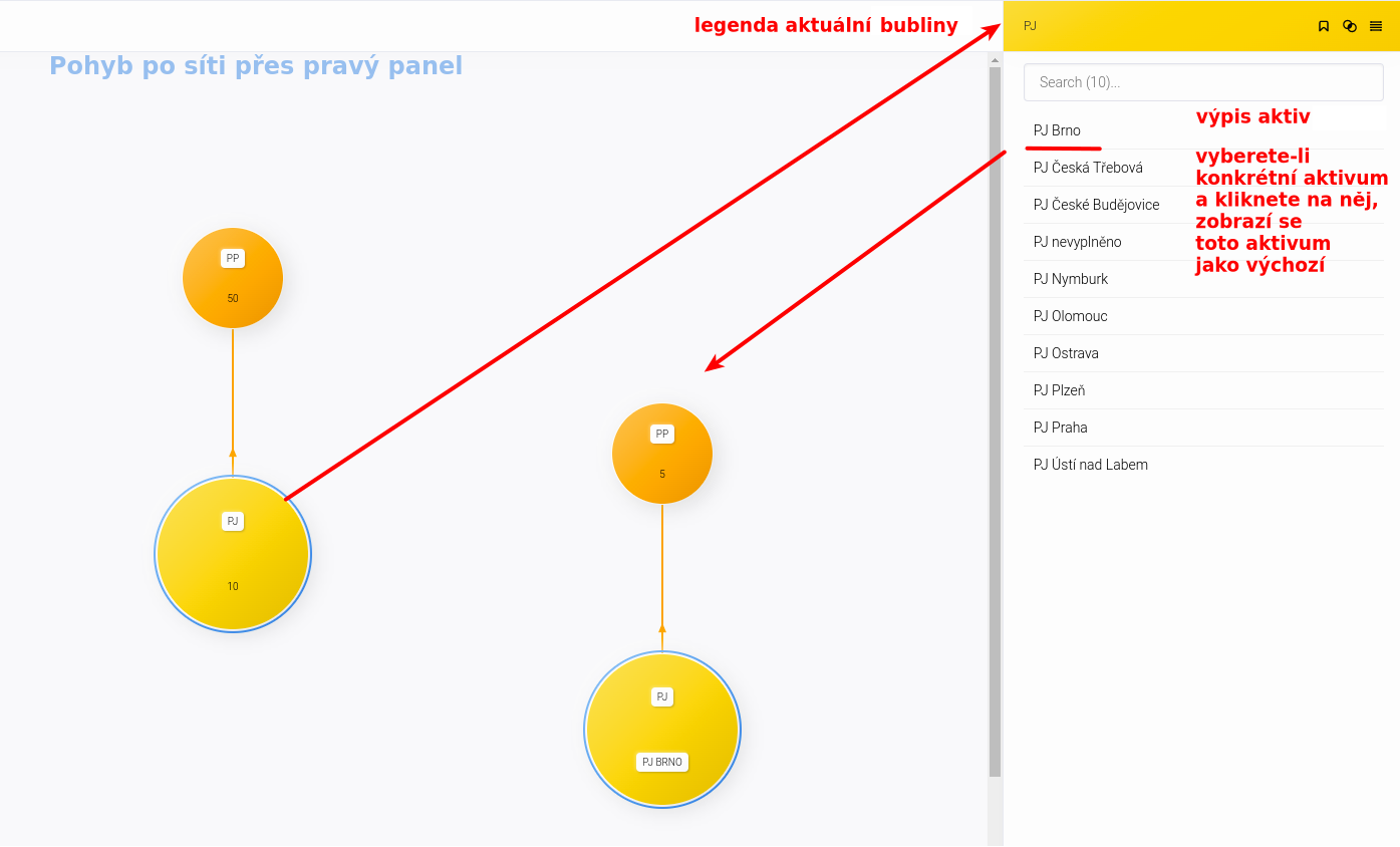 zobrazí se toto aktivum v síti jako výchozí / největší. Tento způsob přechodu z aktiva na jiné aktivum funguje podobně jako pohyb po horní polovině bublin.
